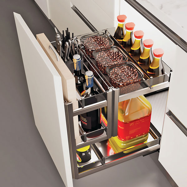 Đối với sản phẩm kệ sử dụng ray âm giảm chấn cao cấp, được thiết kế nhiều tầng, được lắp âm tủ giúp lấy đồ nhanh gọn, đặc biệt chắc chắn, chứa đựng trọng tải lớn