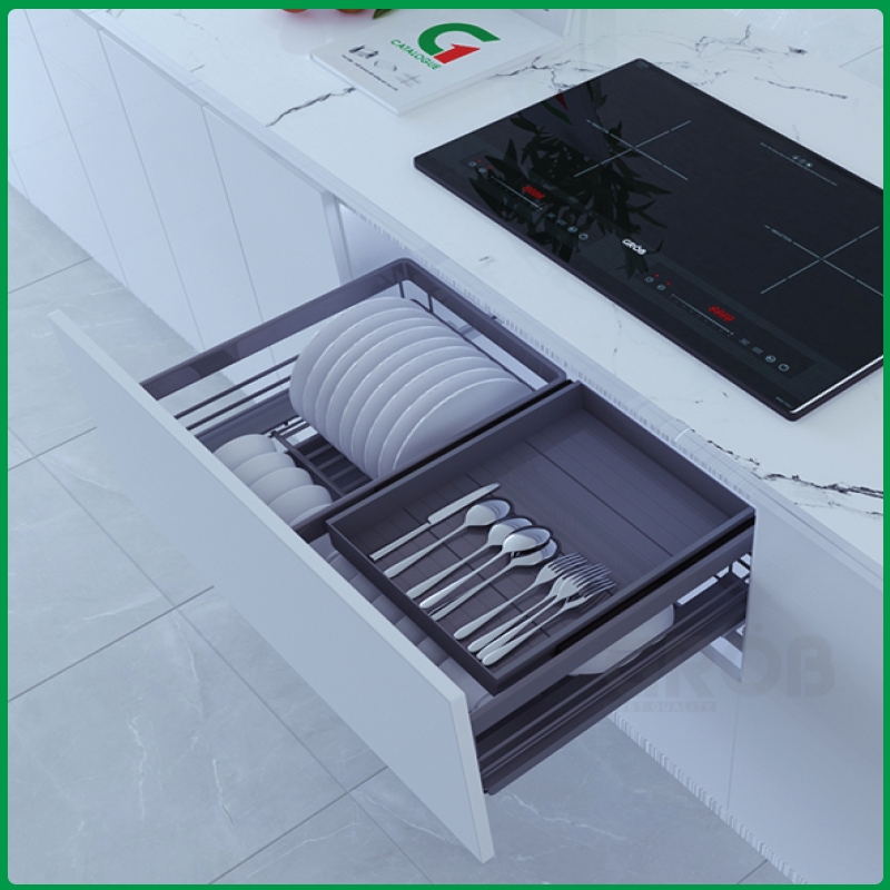 Tích hợp nhiều ngăn và tầng để lưu trữ bát, đĩa, thìa đũa và dụng cụ nhà bếp khác.