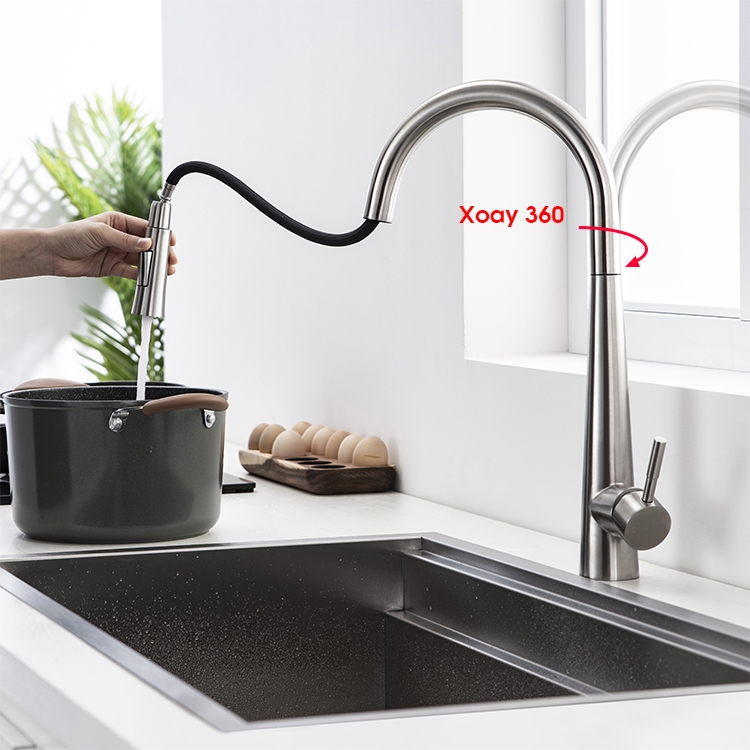 Vòi rửa dạng dây rút có thể đưa vòi tới mọi vị trí trong bồn rửa do khả năng xoay được 360 độ và có thể kéo ra kéo vào, điều chỉnh được độ cao của vòi, độ rộng của nước phun ra một cách dễ dàng.